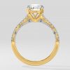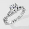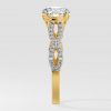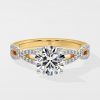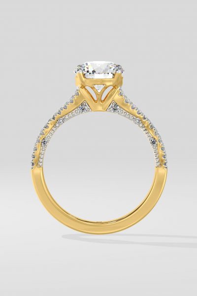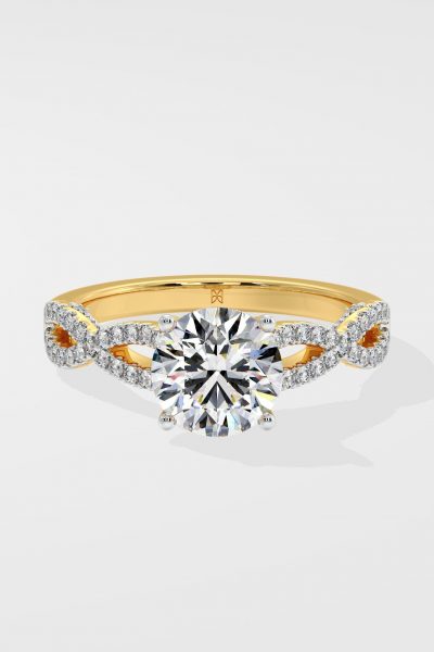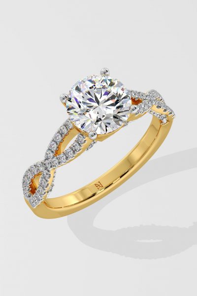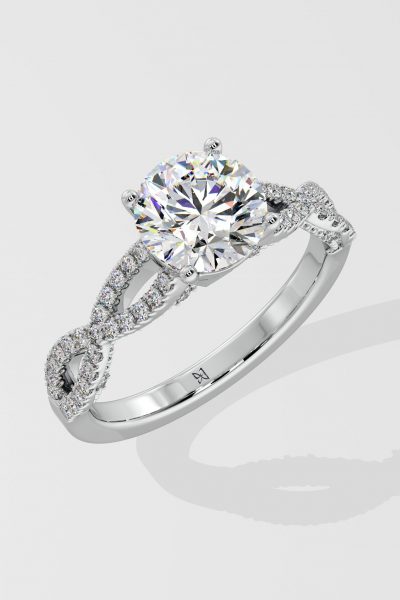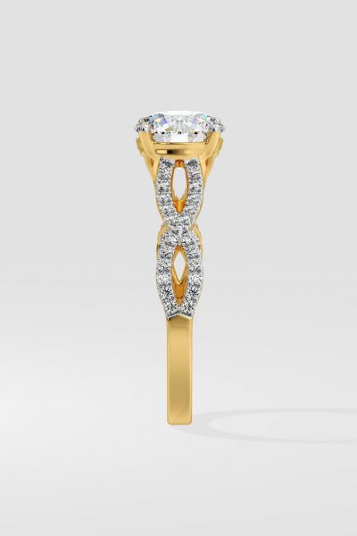 Our 1.5 ct Luna Solitaire Ring features a dazzling 1.5 ct center solitaire with its unique ribbon motif shank. This elegant piece seamlessly blends vintage charm with a modern aesthetic. The side profile highlights smaller studded brilliants.