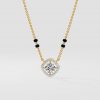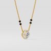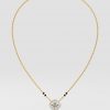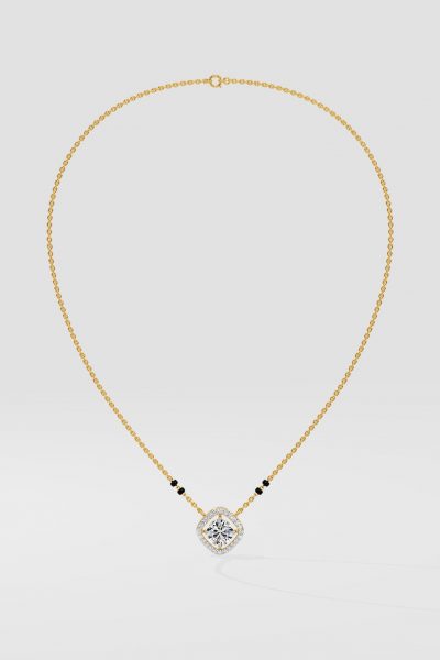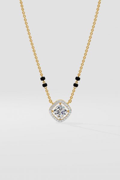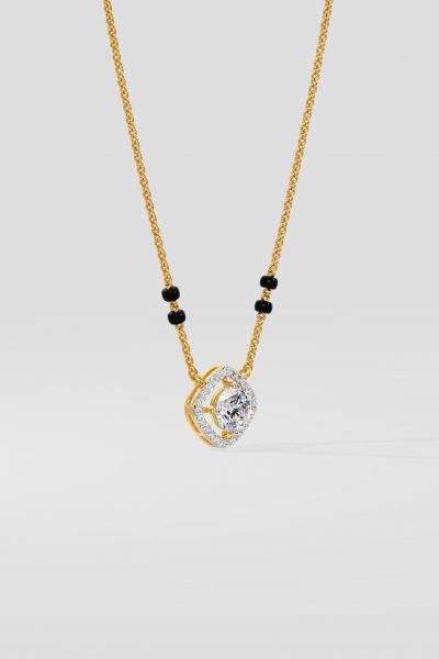 The Celestial Mangalsutra features a 1 ct classic round with a delicate angular cushion halo. A modern take on the traditional black beads, this will fit perfectly in your everyday ensemble.