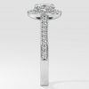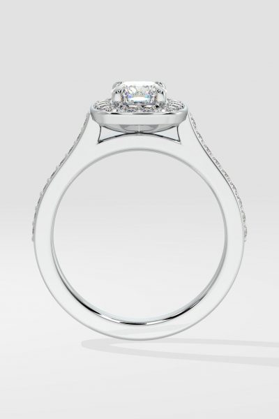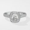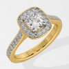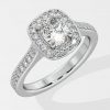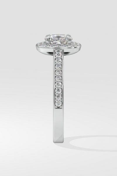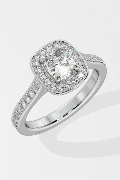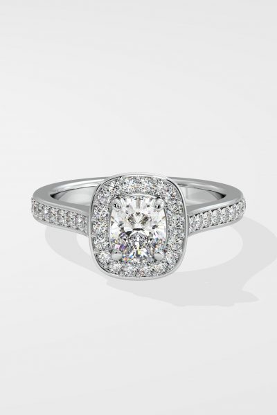 The Cushion Solitaire rings featured a 1 ct cushion cetner with a classic halo. The cushion is a modern diamond shape which is rectangle with rounded edges, gaining immense popularity and truly new age.