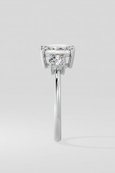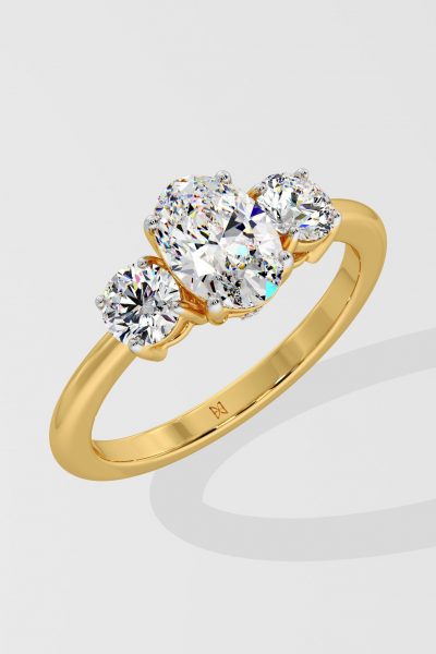This elegant 1 ct oval trio ring features a stunning 0.30 ct round diamond on each side of the center stone, creating a harmonious blend of two distinct shapes. Its simple yet unique design adds a modern twist to a classic look, perfect for timeless elegance.