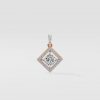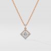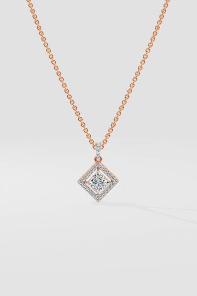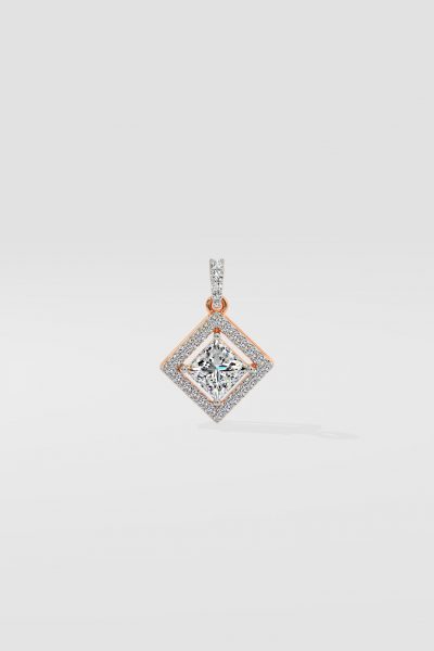 The 1ct Luminous Princess Pendant, featuring a stunning 1-carat princess cut diamond at its center. A spaced square-shaped halo enhances its brilliance, creating a captivating and elegant look.