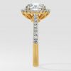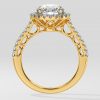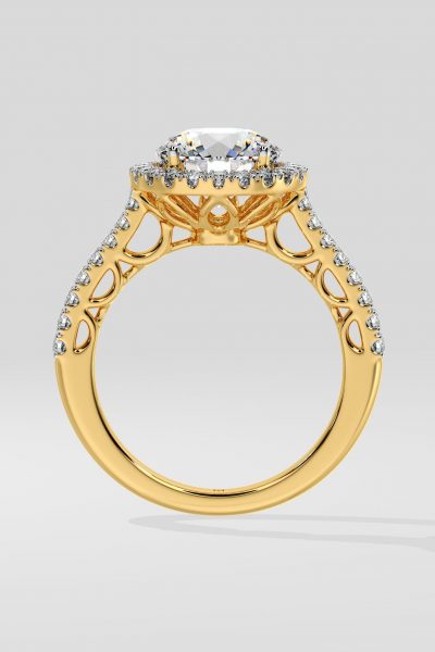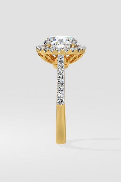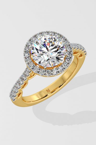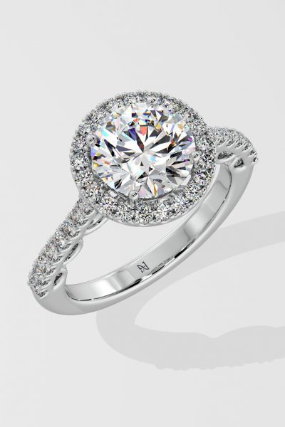 The 2 ct Aurora Halo Solitaire Ring, is a blend of elegance and style. Featuring a 2 ct center diamond embraced by a bold halo, and side diamonds on the shank, this ring boasts a contemporary allure.