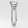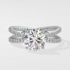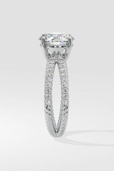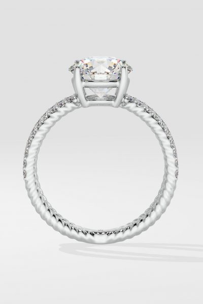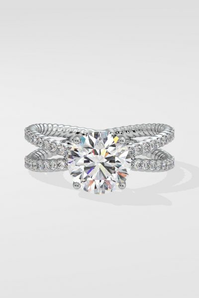 The Crossover Solitaire is a modern favourite. It features a bold 2 ct center diamond with perfectly balanced studded shanks. Beyond the studded shank the wire/cable mesh look continues all the way to the base. The centre diamond can be customised to go bigger/smaller along with your choice of gold colour.