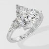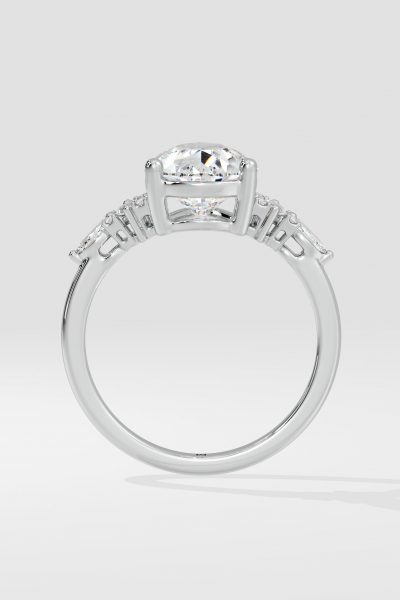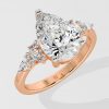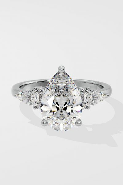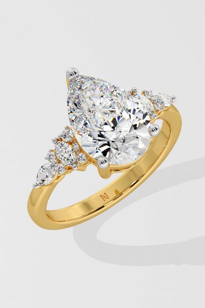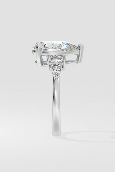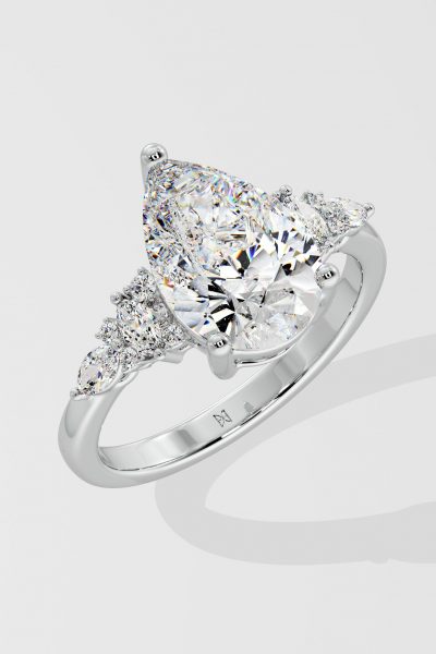 The Dahlia Ring features a 2 ct pear-shaped centre, flanked by marquise and round diamonds on the sides carving our a beautiful detail. Its tasteful and elegant design ensures it stands out just the right amount.
