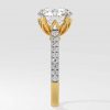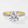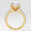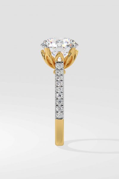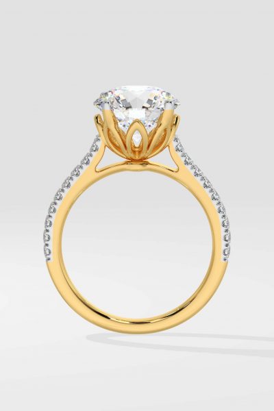 The Lotus Solitaire Ring brings to light a shimmering 2 ct Round brilliant, set in 4 prongs over a beautiful lotus shaped basket mount. Side diamonds encrusted on the shank accentuate the center solitaire. Add an optional gold diamond band to complete the look to make it a stack worthy of everyday.