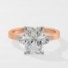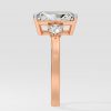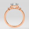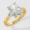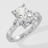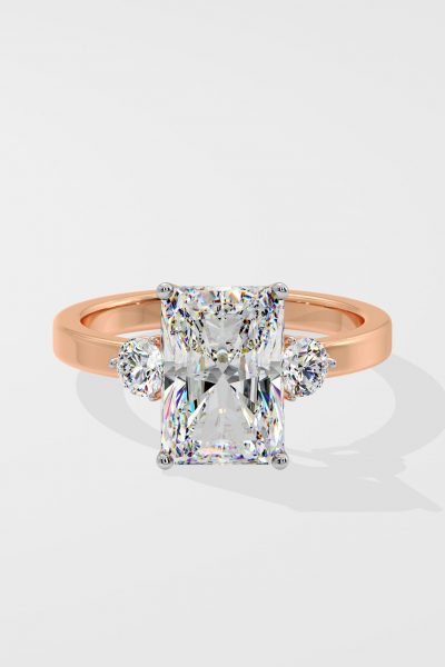 2ct Radiant Accent Ring, featuring a stunning 2ct radiant-cut diamond at its centre and accented by delicate 0.15 ct round diamonds on the sides. A bold rectangle diamond beautifully compliments the round sides.