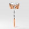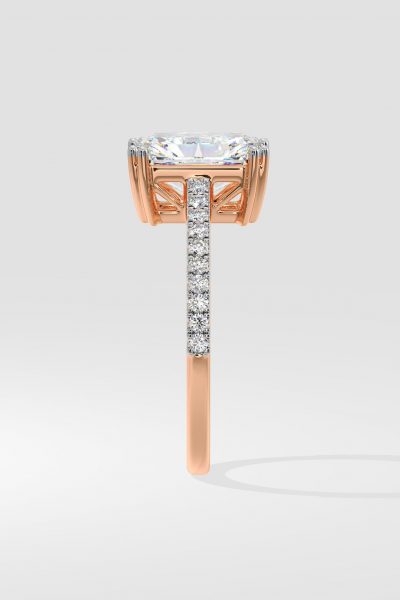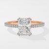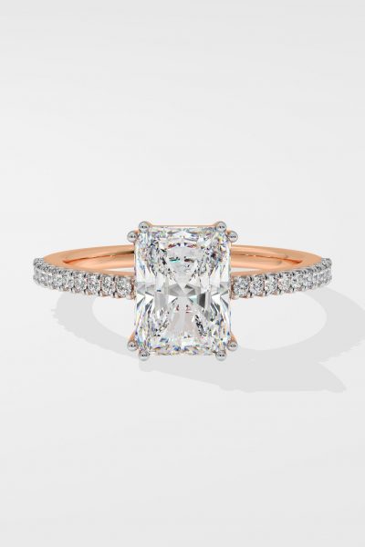 The 2 Ct Radiant Solitaire is quickly becoming the first choice for non-round solitaire rings. A contemporary brilliant cut stone, the radiant has a stunning fire. The side prongs here have been split to maximize the strength while preserving the delicacy of the all-diamond look. A modern classic if we may call it.