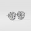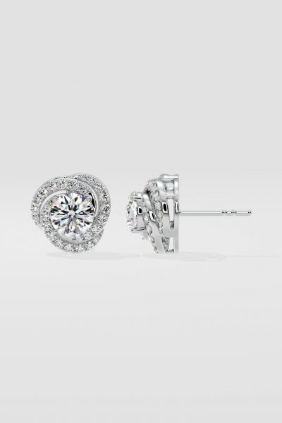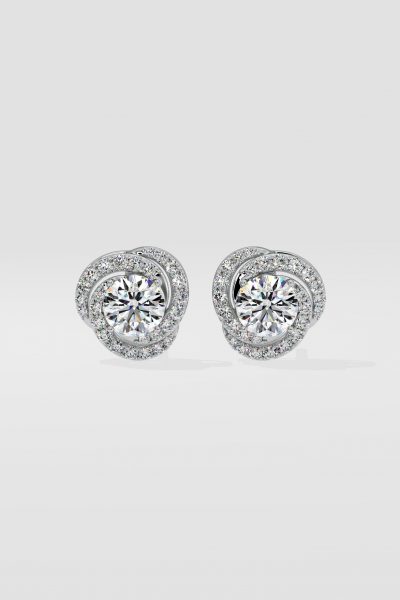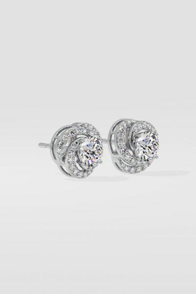 Our 2 ct Swirl Halo earrings are each adorned with 1 ct round brilliant diamonds and a unique three-way swirl halo for extra sparkle. A stunning standout piece sure to captivate all eyes, with an optional detachable jacket available upon request.