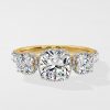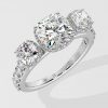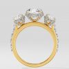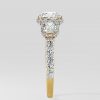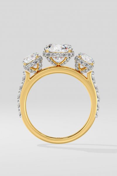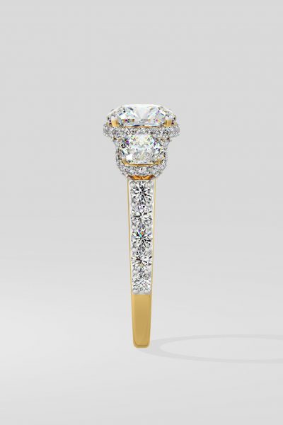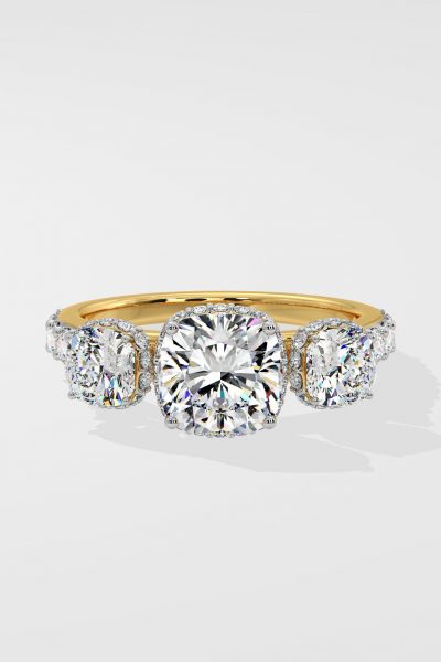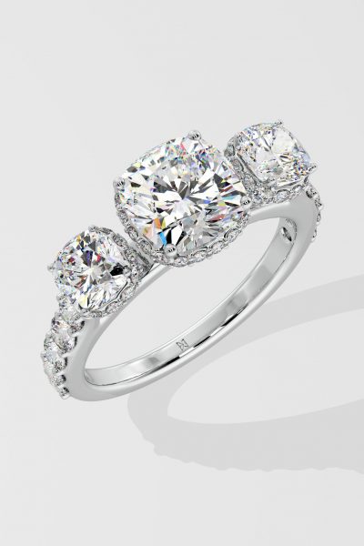 The Trinity Cushion features a 2 ct centre flanked by 0.5 ct cushion-cut stones, each encircled by a halo. Further diamonds on the band complete the all diamond look. One for the fans of the tasteful cushion cut diamond.