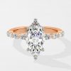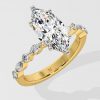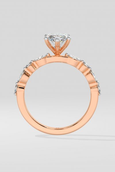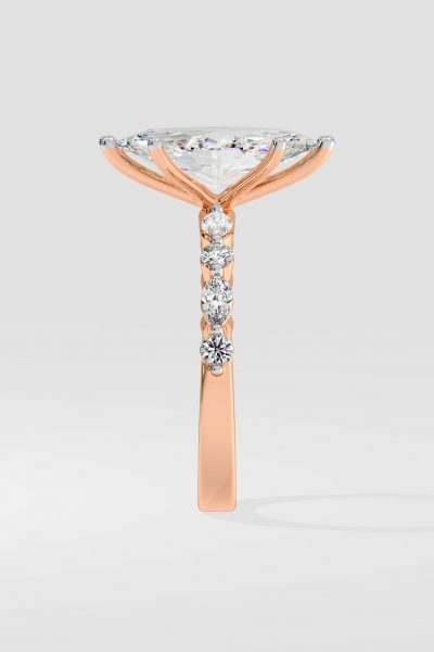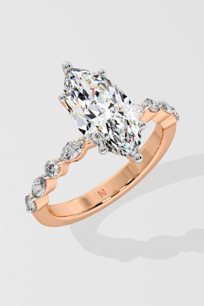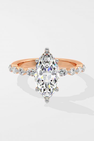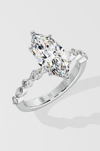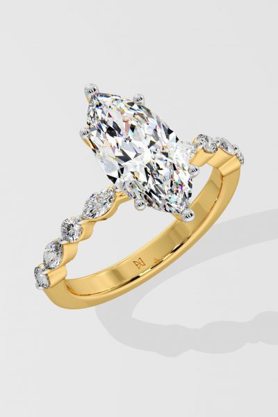 The 2 ct Marquise Dawn Ring, featuring a stunning elongated marquise centre diamond complemented by a delicate band of round marquise stones. Its vintage-inspired design merges classic charm with contemporary style.