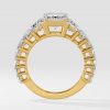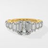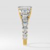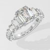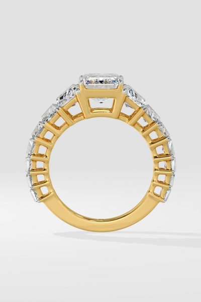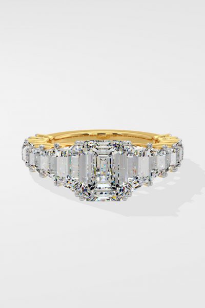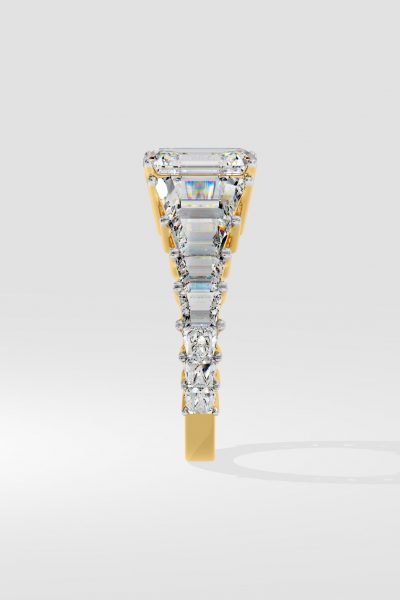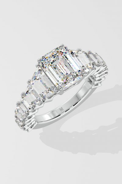 The Emerald Grandeur Ring is a modern masterpiece. The center starts with a 3 ct solitaire and graduates down from 0.50 ct trapezoids specially cut in specific sizes. A ring unlike any other, the flair and grandeur of this ring truly stands out.