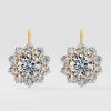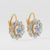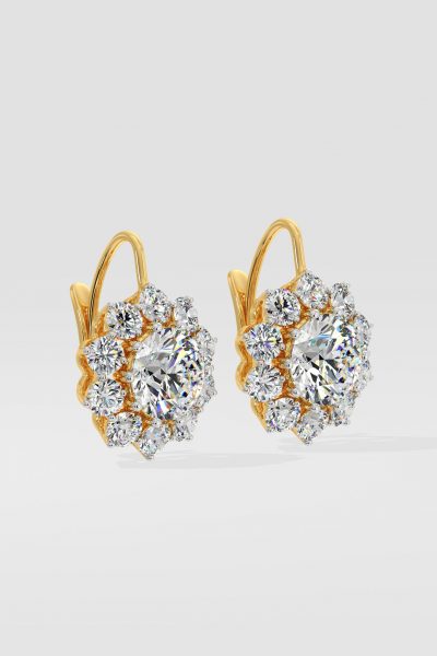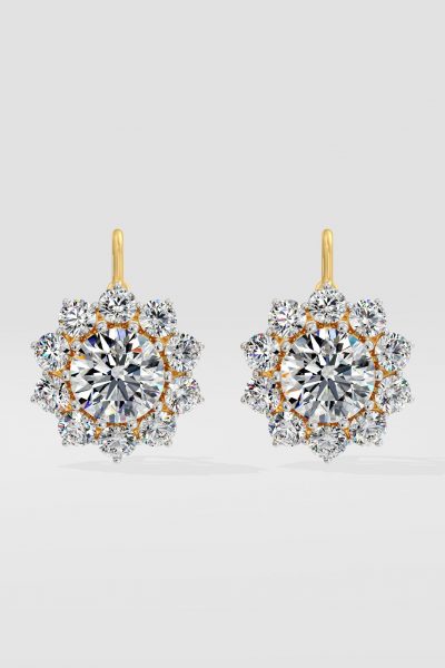The 4 ct Fleur Earrings feature shining 2 ct centers, encircled by 10 pointer round brilliants. Bold, classic and dazzling, this piece is an heirloom. The leverback enables for a classic minimal dangle, a refreshing twist from the normal studs.