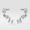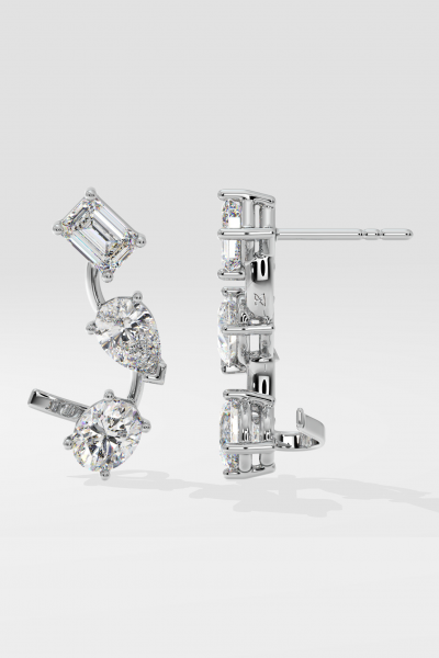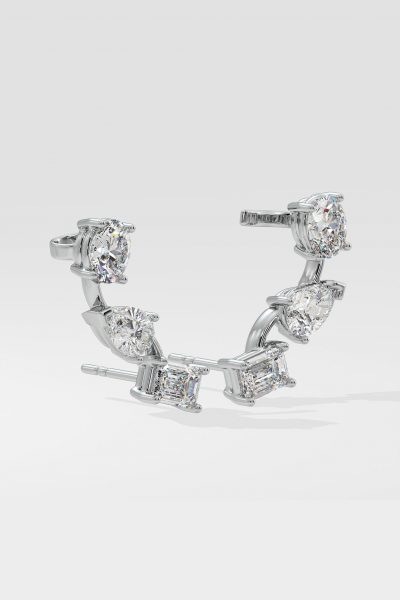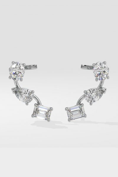 The 3 stone ear cuff studs are mixed shapes in 1/3 ct solitaires. These earrings sit on the ear cuff and have an adjustable hook at the back to firmly secure the hold.