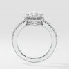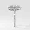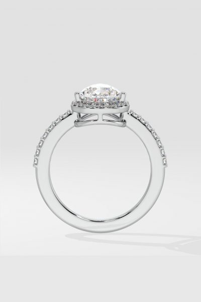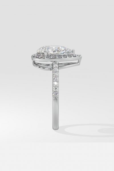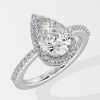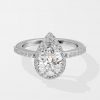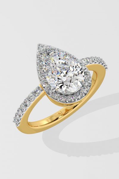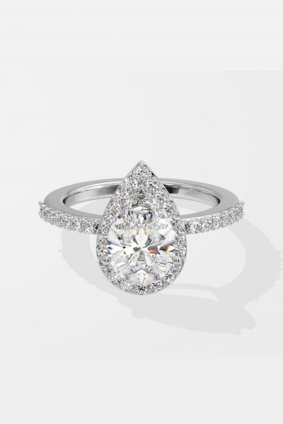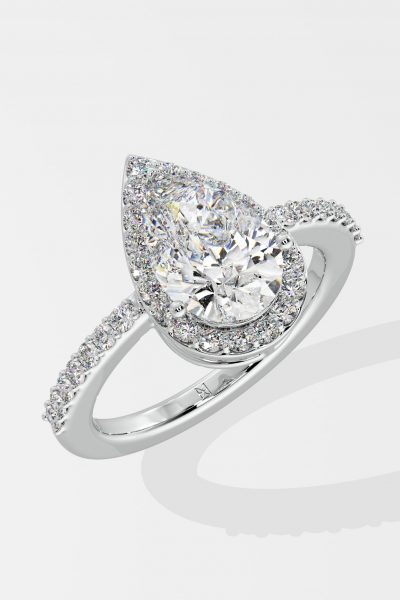 The Pear Halo Solitaire Ring features a 1.5 ct center stone set with a classic halo and diamond-studded shank. Pear, also popularly referred to as drop shape is one of the special diamonds that provide a larger surface area for a lower weight; and adding the Halo enhances the look almost 20% more. Go big, go bold.