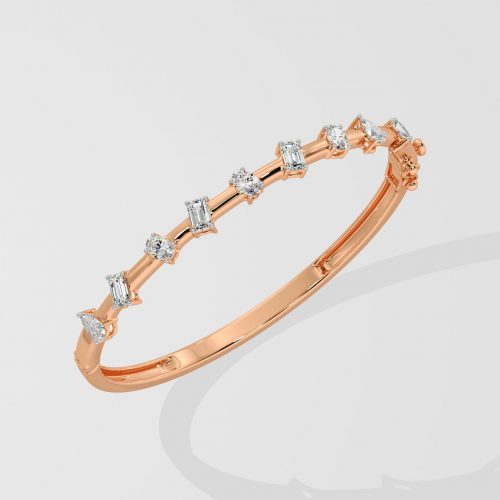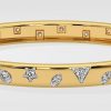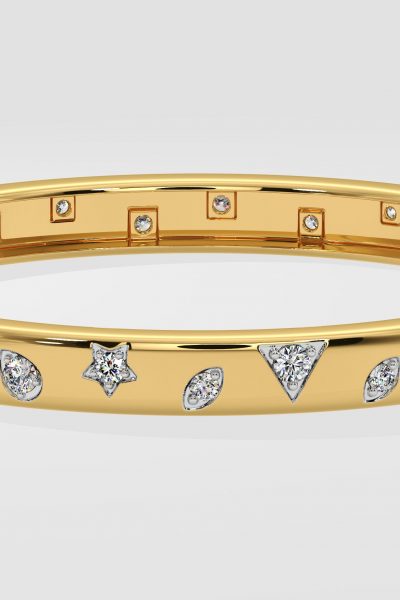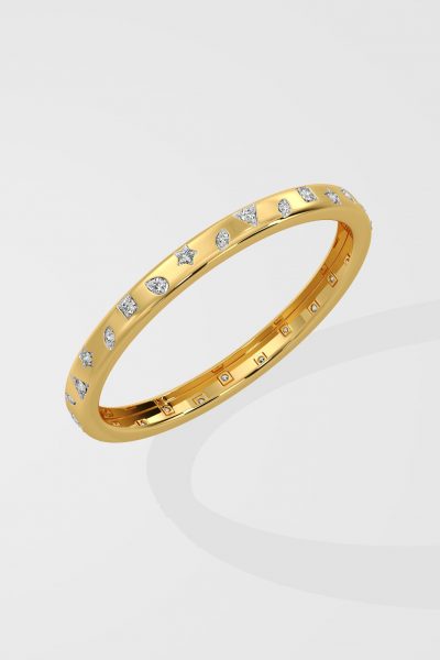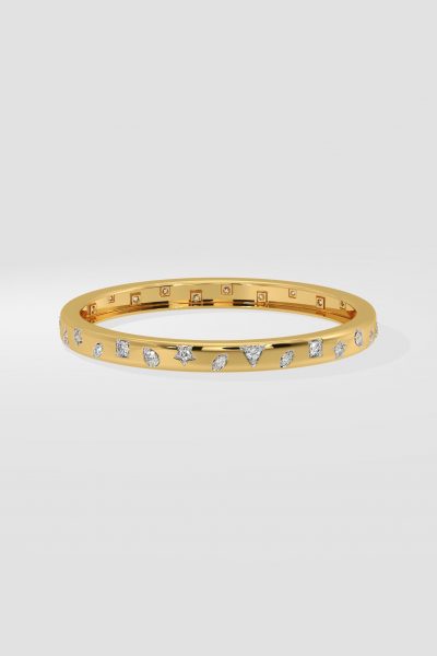 Presenting our Askew Sparkle Bangle, where bling meets playfullness. Adorned with 0.10 ct diamonds in multi-shapes, each set delicately within the bold gold bangle. A solid gold style with playful diamond accents, this one contemporary bangle can do it all.
