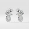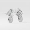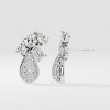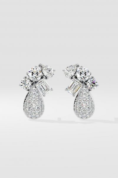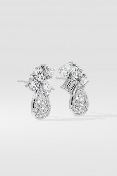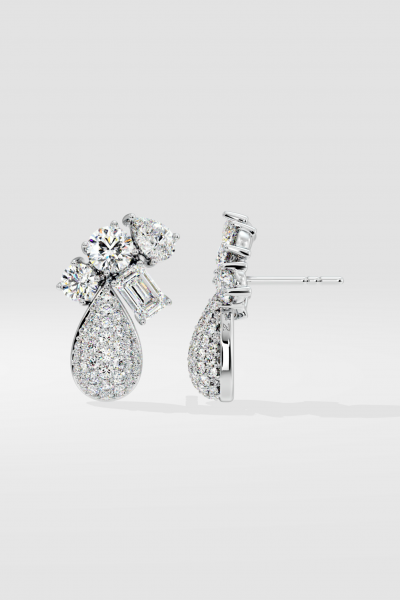 A combination of Pear, Round and Emerald cut diamonds come together to make a bold statement for this pave set drop dangler. The mini solitaires range from 1/4 to 1/3 ct along with the micro pave set round brilliants.