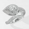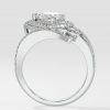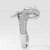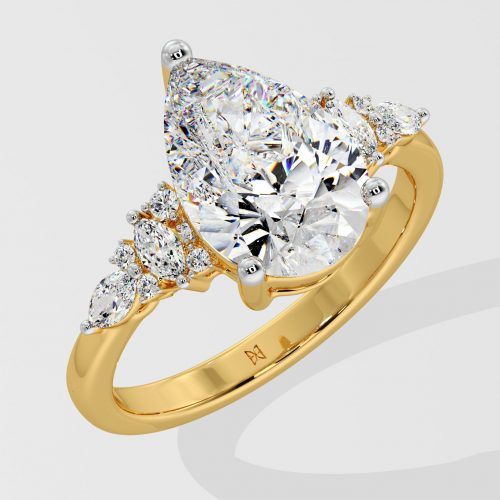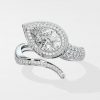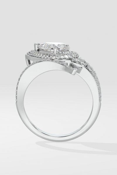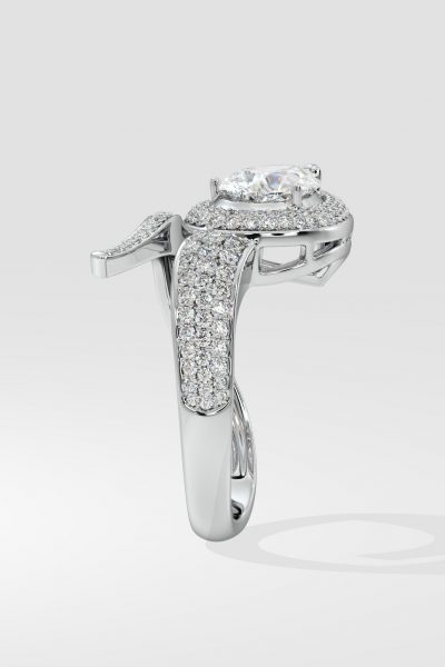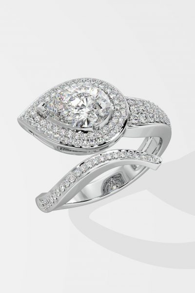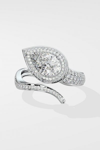 The Ellipses Ring features a stunning 1 ct angular pear-shaped solitaire with a prong halo. The Pear shaped diamond offers more spread for the same carat wt. The asymmetrical fully diamond-encrusted shank completes this bold and contemporary design.