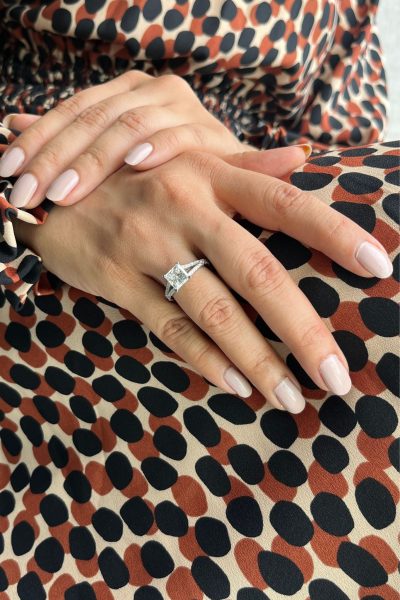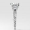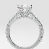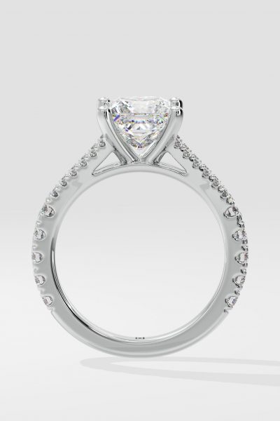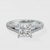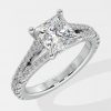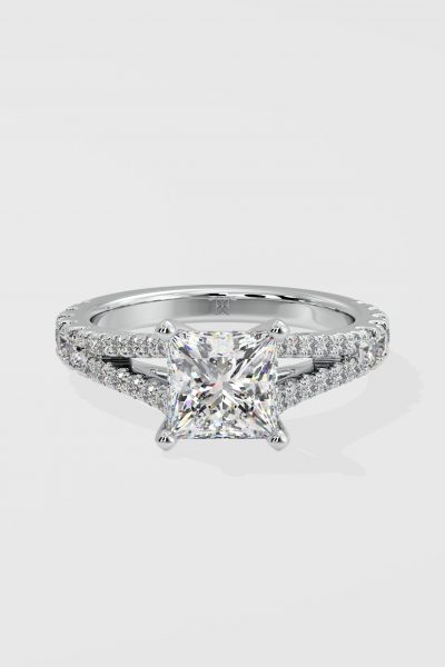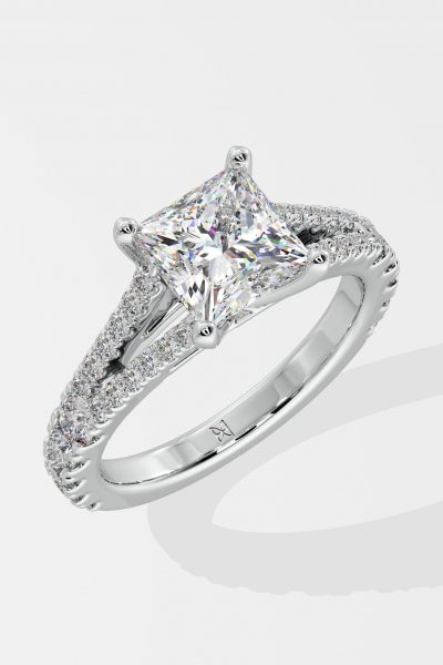 The Princess Solitaire Ring highlights the center, a 1.5 ct Princess Cut. The split shank design in this particular ring is also studded to complete the all-diamond look. Go bigger with a 2 ct center optionally. Available in color options of gold, white, and rose.