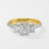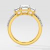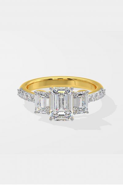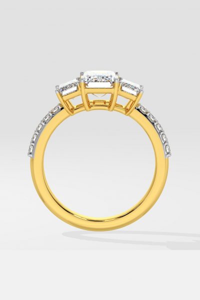 The 3 Stone Anniversary ring is a classic picture of the past, present and future. It features a 1 ct center stone flanked by two 1/3 ct solitaires, and a delicate diamond studded shank. The perfect 3 year anniversary gift.