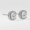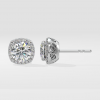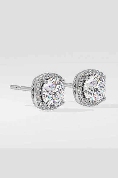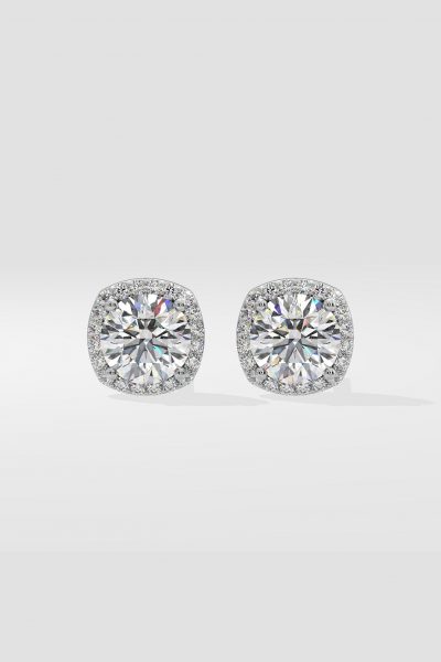 The Cushion halo studs feature 1 ct solitaires enveloped in a contemporary sharped halo. An elevation from the classic halo to give these essential daily solitaries a little pizazz.