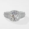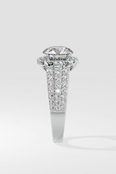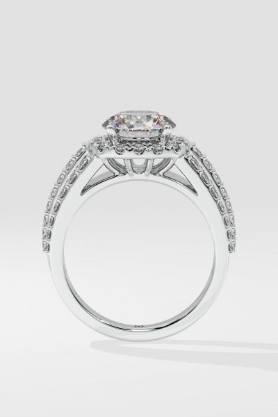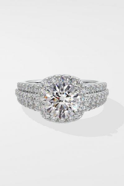 The Bedazzle Cushion Halo Ring is truly a dazzling beam of light. Featuring a 1.5 ct round brilliant center with a cushion halo, and combined with a triple row diamond-studded shank, this one is all diamond shining bright. Own the spotlight and exude brilliance with this stunner.