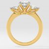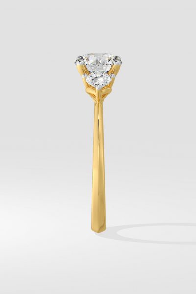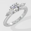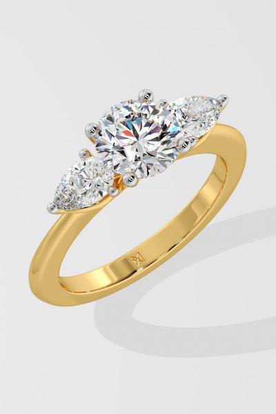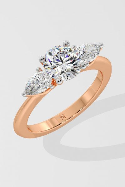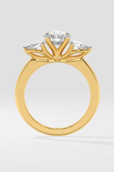 The Opera three stone ring features 1.5 ct solitaire as a center diamond with 0.30 pointer pears on the side. A twist on the classic 3 stone, this one has an edgy modern flair.