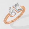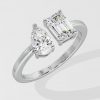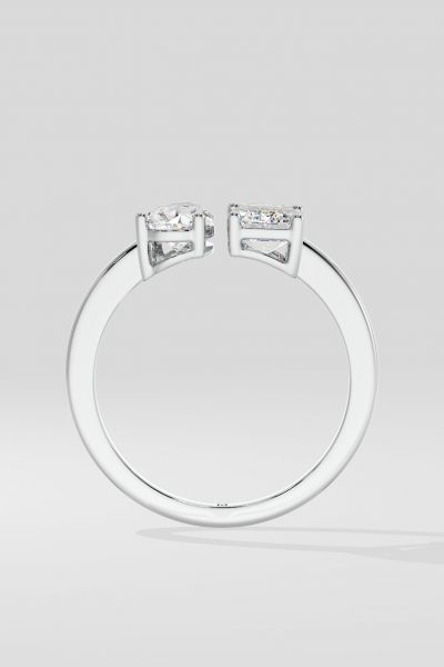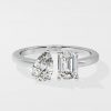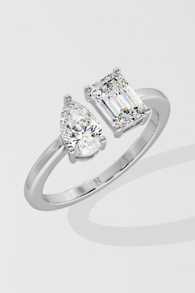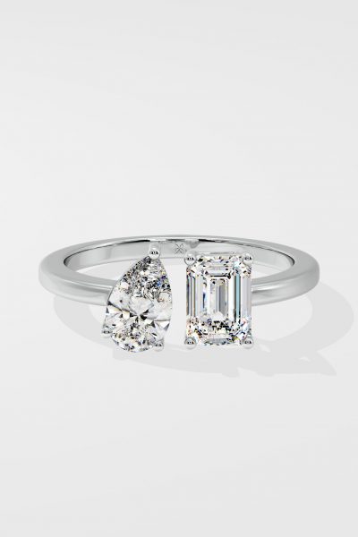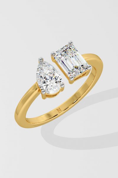 The Pear & Emerald Toi et Moi Ring features a stunning pairing of a 2 ct emerald cut and a 1.5 ct pear-shaped diamond. Set on the classic gold band.