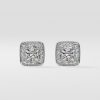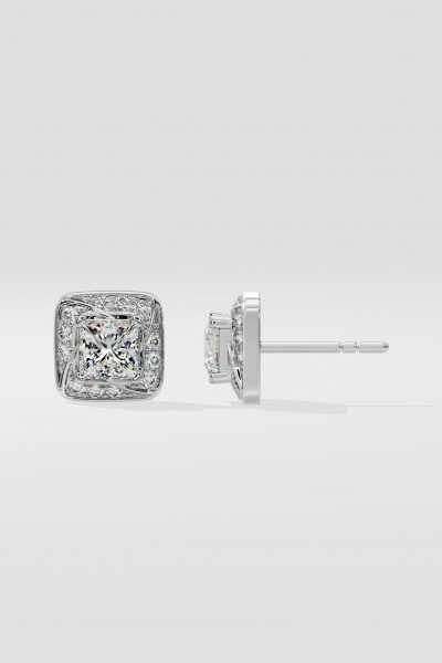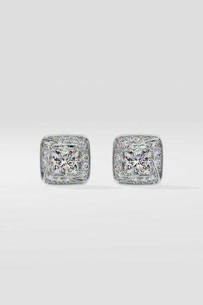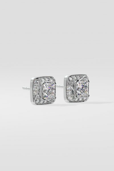 The 0.50ct Princess Halo Earrings feature a stunning 0.25ct princess-cut solitaire at the centre, surrounded by a square halo of smaller diamonds. This halo design enhances the brilliance and sparkle, creating a dazzling effect.
