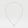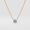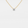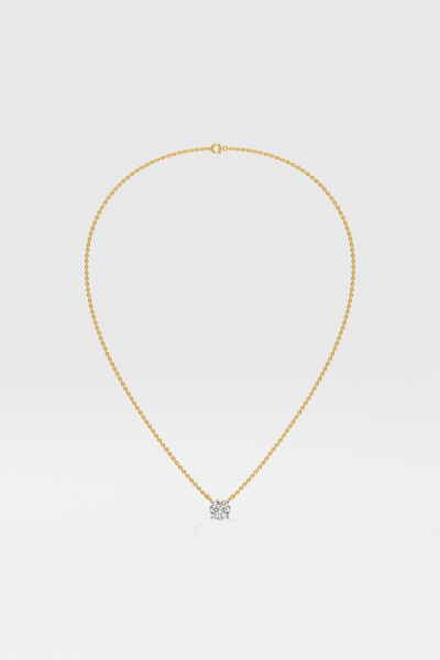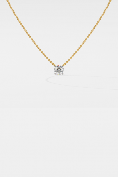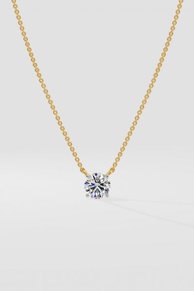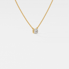 A classic solitaire pendant combines well with everything in your neck stack. This 0.75 ct round brilliant is elegance and sophistication. Classic prong setting with the dainty chain attached at an angle to let the diamond sparkle. Will look great in a rose gold option too.