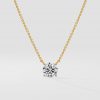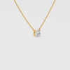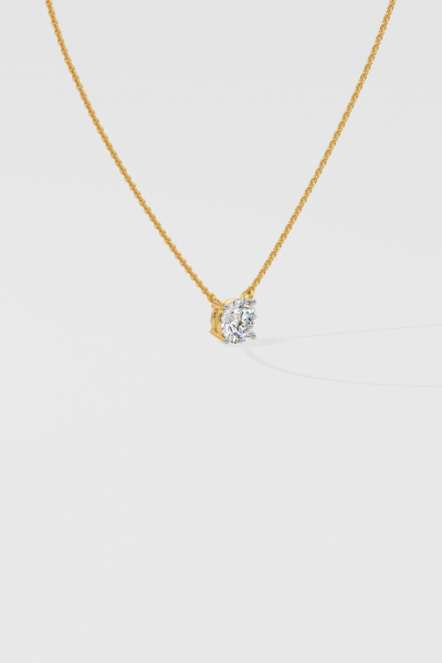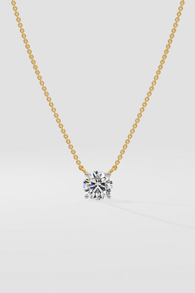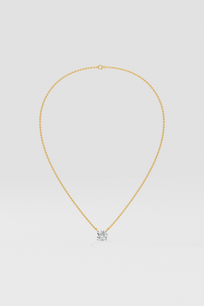 A classic solitaire pendant combines well with everything in your neck stack. This 2 ct round brilliant is elegance and sophistication. Classic prong setting with the dainty chain attached at an angle to let the diamond sparkle. Will look great in a rose gold option too.