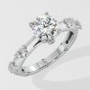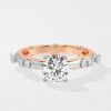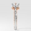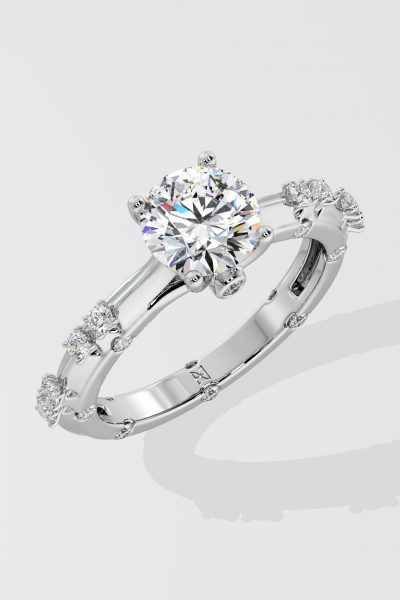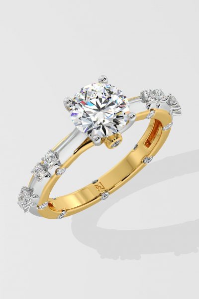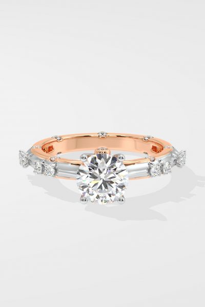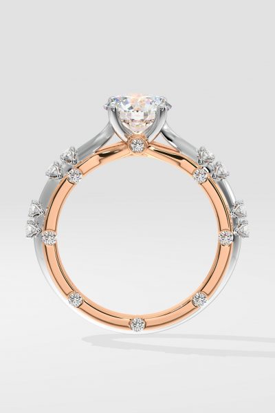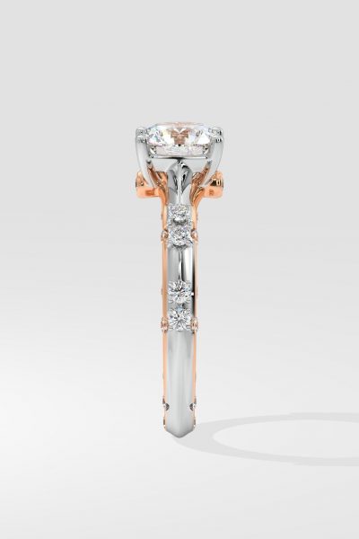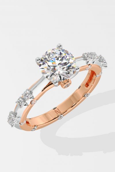 The Crossover Solitaire Ring features a 1.25 ct center stone set in classic 4 prong. Continuing the spaced diamond feel, this two-tone ring has beautiful side studded diamonds. Like a fine piece of art with layered small elements, this intricate ring stands out in its Rose + White Gold look.