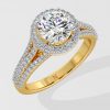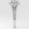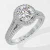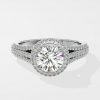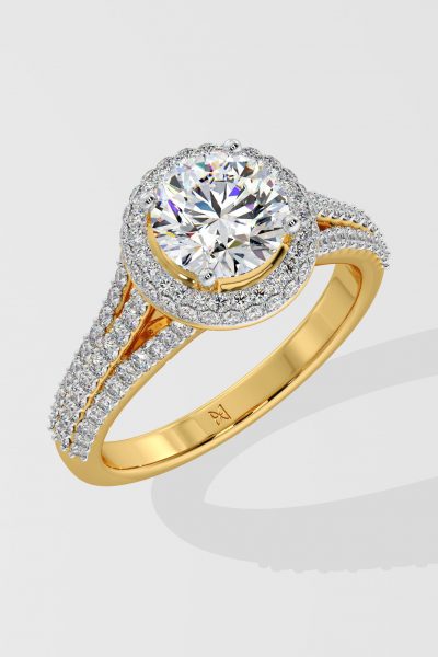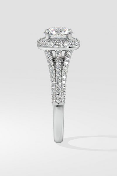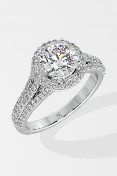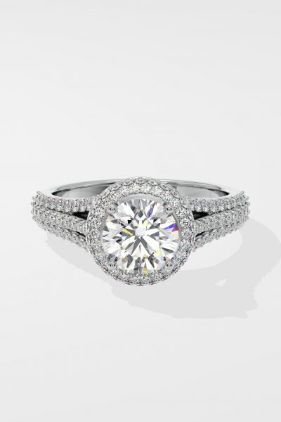 The Crossover Solitaire features a 1ct center with a stunning diamond encrusted halo. Completely studded with smaller diamonds this soltaire ring is a masterful piece of workmanship.