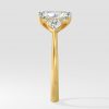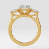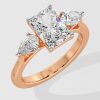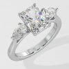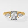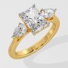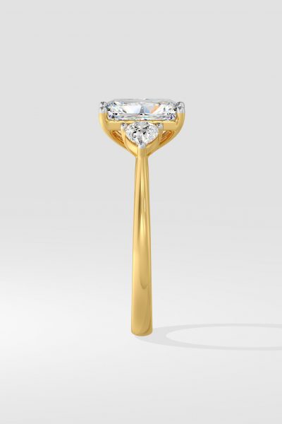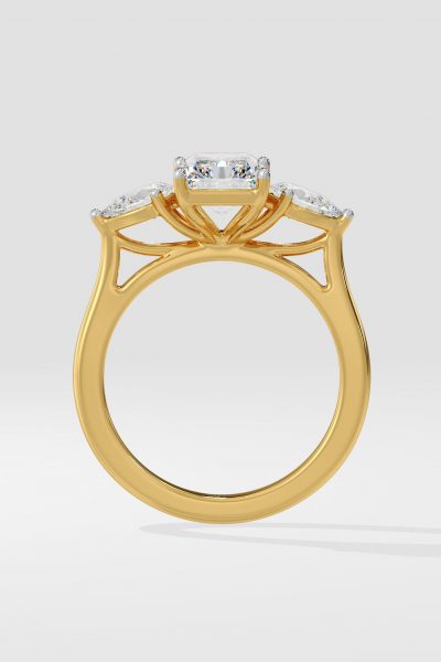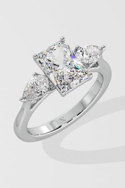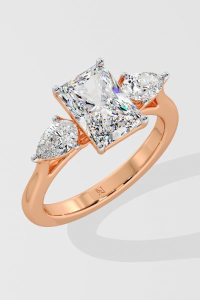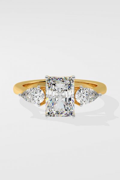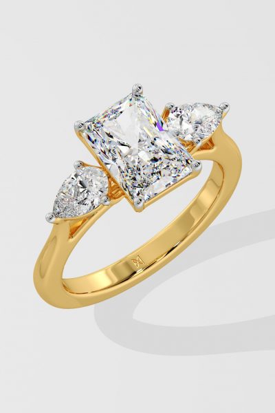 The symphony three-stone ring features 2 ct Radiant as a center diamond with 0.30 pointer pears on the side which gives it an elegant look. You can change the center stone with your desired shape.