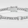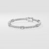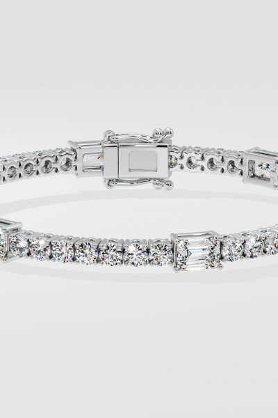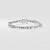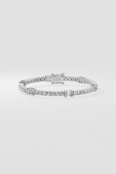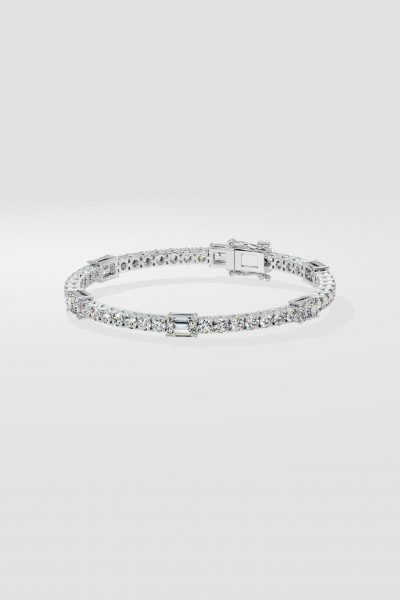 The Ember Bracelet features 1/2 carat emerald-cut diamonds interspersed with 0.07 ct round solitaires. A classic with a twist the emerald cuts adds a touch of timeless sophistication for this style. The all diamond look works well in white gold.