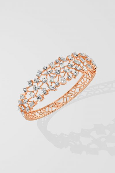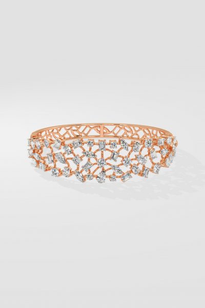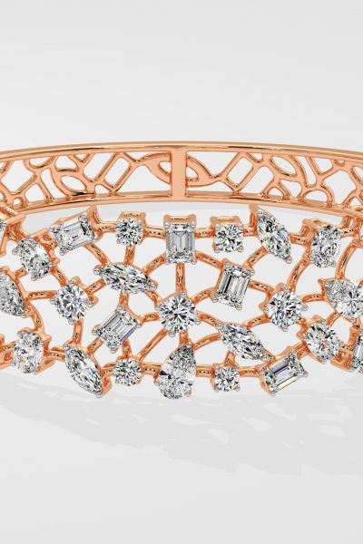 The Terrazo Oval Bangle features a stunning array of 0.15 ct diamonds in various shapes, creating a dazzling display of light. This exquisite bangle stands out with its asymtterical pattern, offering a modern take for the single bangle.