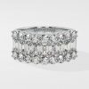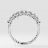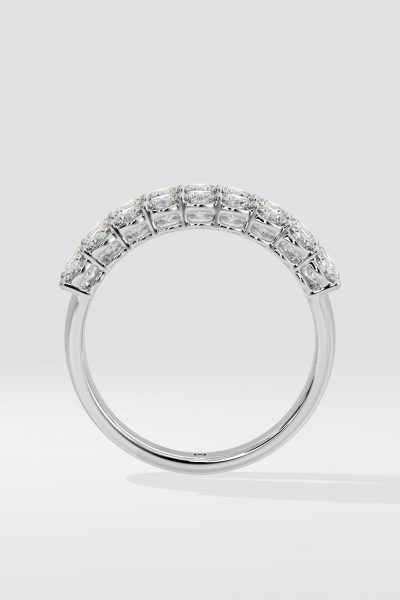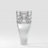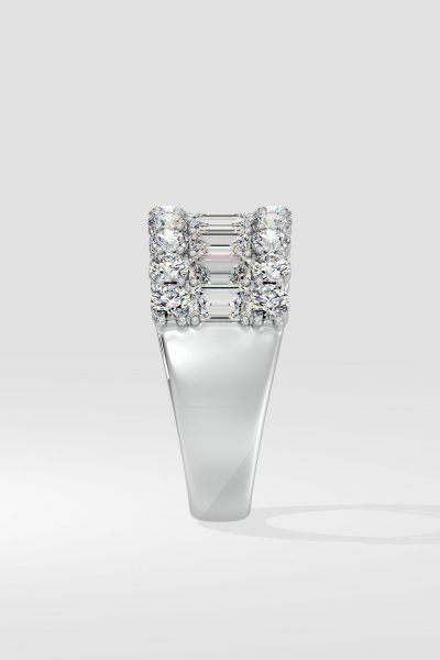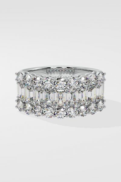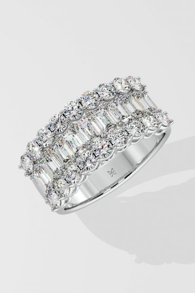 The Triad Glamour Band features a 0.25 ct emerald-cut diamond flanked by 0.10-ct round diamonds, creating a bold yet simple design. Its stacking effect adds versatility, making it perfect for any occasion.