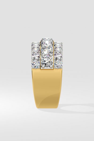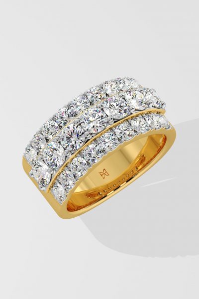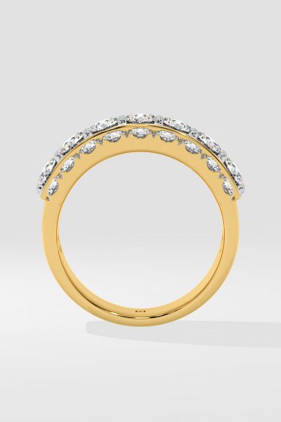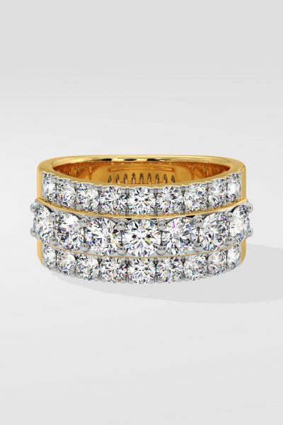 The Triad Shimmer Band, adorned with 0.25 ct diamonds in the middle row and 0.10 ct diamonds on the top and bottom rows. A wider bolder band with dazzling diamonds for the non-solitaire look.
